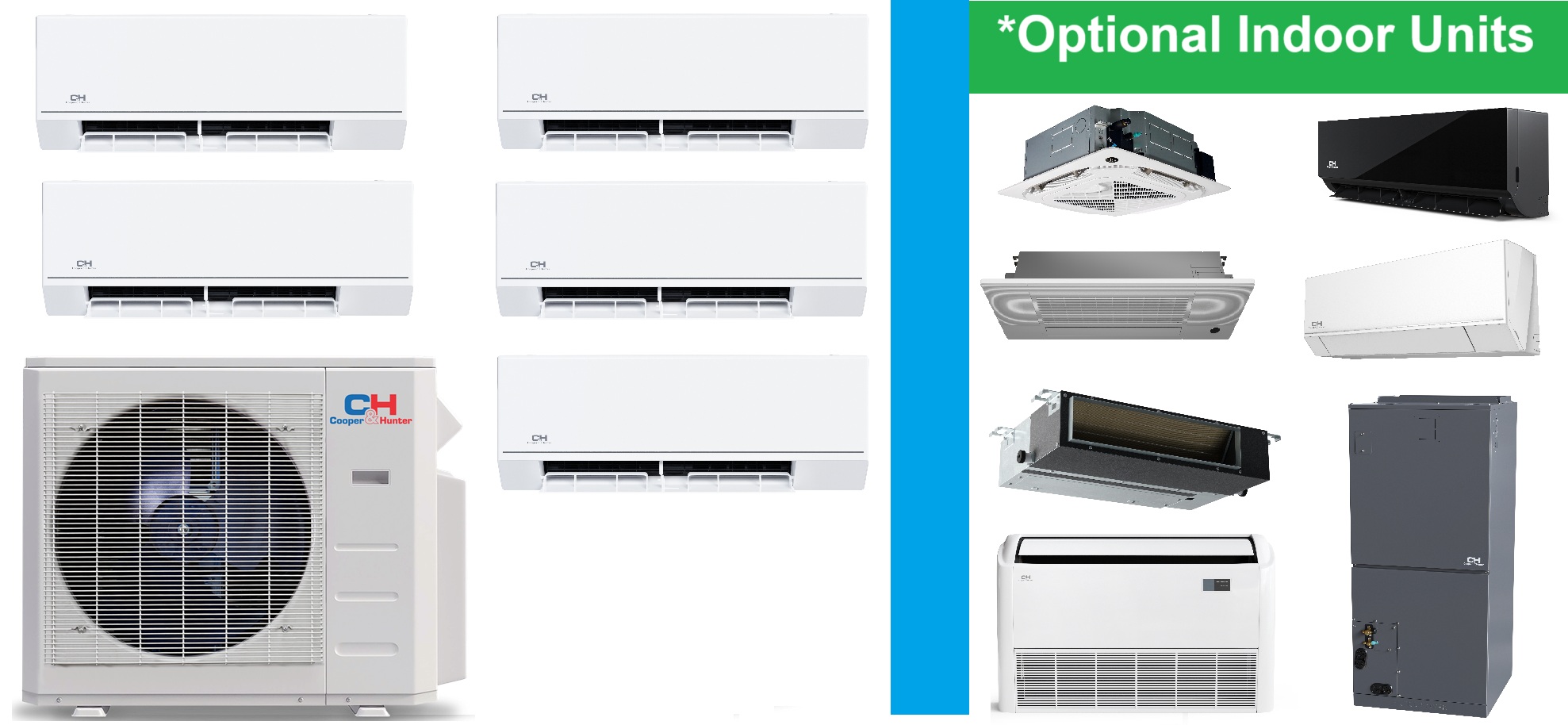 *This Customizable C&H Quint Zone Package Includes: *Five (5) Ductless Wall Mount *Indoor Units (w/ Remotes & WIFI) *Outdoor and Indoors can be upgraded via the dropdown boxes above.