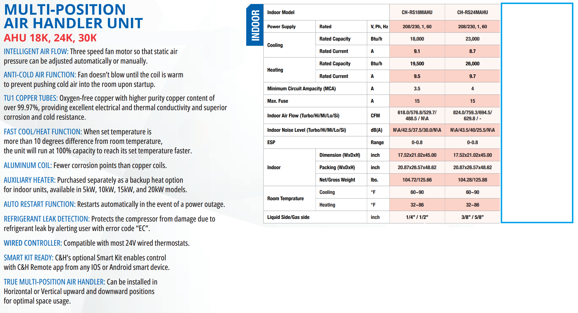 • INTELLIGENT AIR FLOW ANTI-COLD AIR FUNCTIONTU1 COPPER TUBES FAST COOL/HEAT FUNCTION  ALUMINUM COIL: Fewer corrosion points than copper coils. AUTO RESTART FUNCTION REFRIGERANT LEAK DETECT WIRED CONTROLLER: Compatible with most 24V thermostats. TRUE MULTI POSITION AIR HANDLER: Horizontal, vertical, or downward installation.