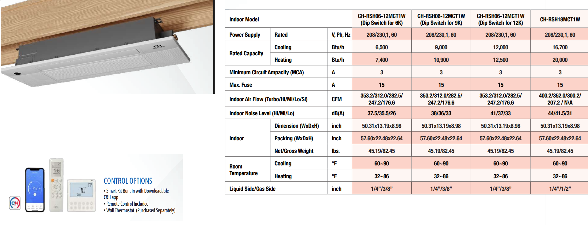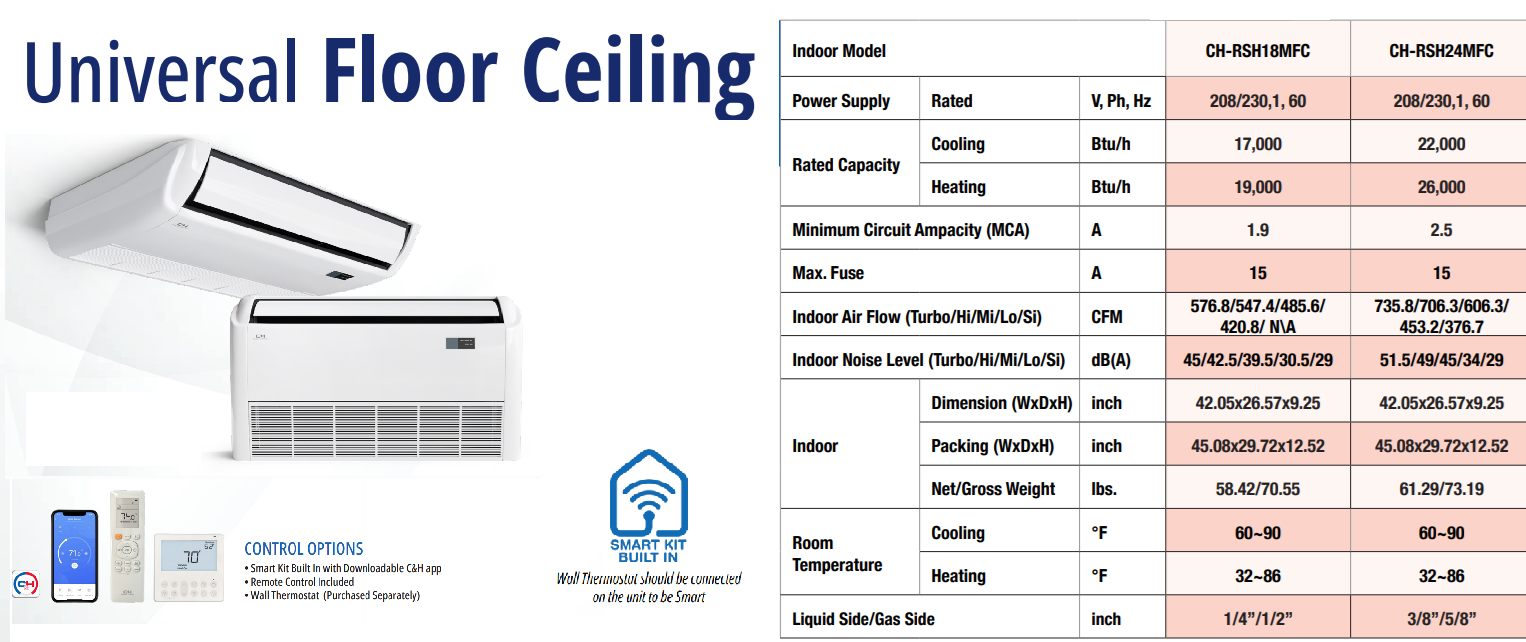 Floor or Ceiling Mount (Universal) : Universal Floor/Ceiling units offer flexibility in regard to location, as they can be installed horizontally on a ceiling or vertically on a wall. These units can be conveniently controlled by remote control, wall thermostat, or C&H Remote app. Universal Floor/Ceiling units are available in 18K and 24K models. Condensate Pump NOT Included