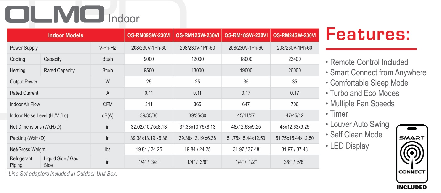 OLMO 2 Room Mini Split AC Heat Pump (-13°F) WIFI, E-Star: 22 SEER2/13.3 EER/10 HSPF (R454B)