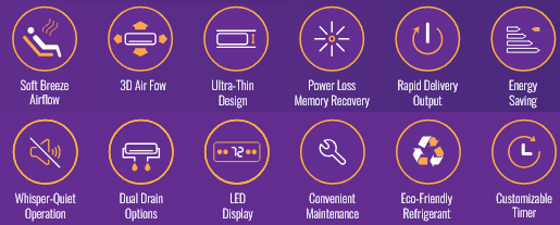 Soft Breeze Airflow, 3D Airflow, Ultra-Thin Design, Power Loss Memory, Rapid Delivery Output, Energy Saving, Whisper Quiet Operation, Dual Drain Options, LED Display, Convienent Maintenance, Eco Friendly Refrigerant, Customizable Timer